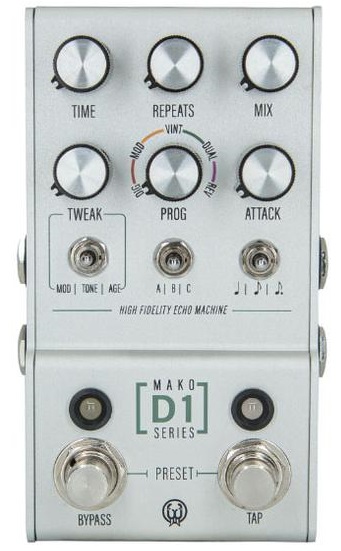 The first in the Mako series, the D1 is a powerful multi-function delay with five, studio grade, high-fidelity, custom tuned programs. The programs are Digital, Mod, Vintage, Dual and Reverse. Each can be tuned and tweaked with modulation, tone, age, and subdivisions. The attack knob adds another dynamic to each program, opening up a new world for creating soundscapes. The D1 boasts stereo in and out, midi control and on-board presets. A workhorse of a delay that is just as ready for the road as it is the studio.